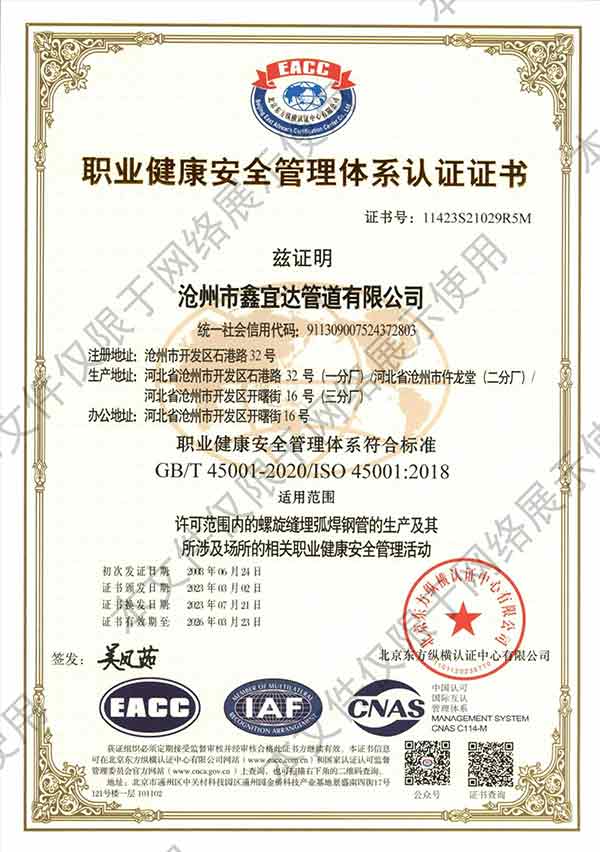 滄州市鑫宜達管道有限公司成立于2003年7月,坐落于滄州經濟開發(fā)區(qū),占地面積40萬平方米,注冊資金1.81億元,是集螺旋鋼管生產、防腐加工以及無縫鋼管、卷板、帶鋼等品類鋼材經營銷售于一體的工貿型企業(yè)。公司現有員工400多人,其中,中高級技術職稱的人員達120余名。 滄州市鑫宜達管道有限公司擁有9條螺旋鋼管生產線和3PE防腐生產線,可生產直徑219--3640mm,壁厚5.5--28mm,最高鋼級X100的各種規(guī)格防腐螺旋鋼管...